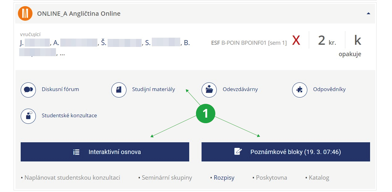 - Zde jsou klikatelné jen odkazy Studijní materiály, Odpovědníky, Informace z poznámkových bloků, Statistika bodů z poznámkových bloků, Naplánovaná online výuka, Studentské konzultace a schůzky.
