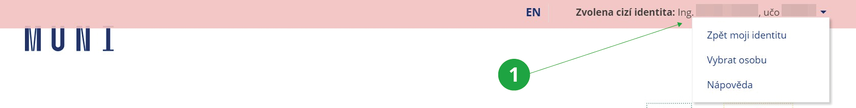 - 5.Jak učitel pozná, že je použita cizí identita?Pokud má učitel zvolenou cizí identitu, pak má v záhlaví každé stránky výrazný červený vodorovný pruh. Jméno studenta se zobrazuje v červeném pruhu. Pokud pruh zmizí, pak jste kliknuli na stránku, na které už právo měnit identitu nemáte a stránku už vidíte pod vlastní identitou (vpravo nahoře bude vaše jméno).