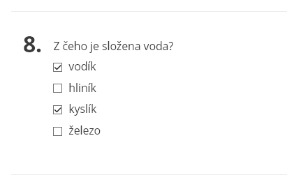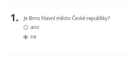 - Radio tlačítka – Typ otázky pro výběr právě jedné správné odpovědi z více možných. Radio tlačítka používají manipulační prvek :r (zkratka z radio button).