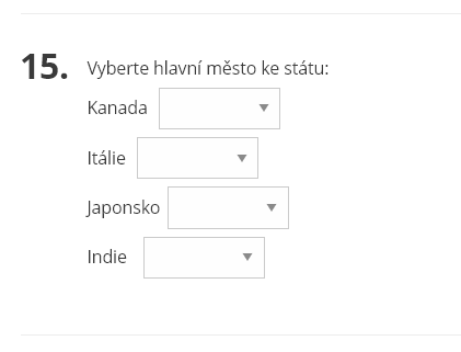 - Přiřazení možností – Typ otázky pro přiřazení možnosti do dvojice s výrazem v zadání. Všechny roletky obsahují úplně stejné možnosti. Přiřazení možností používá manipulační prvek