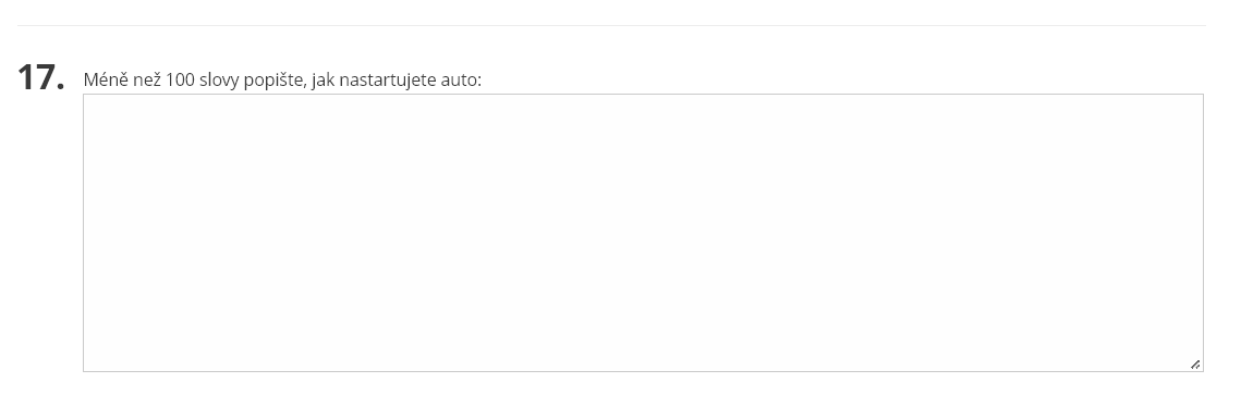 - Textová oblast – Typ otázky s textovou oblastí pro vepsání delšího neformátovaného textu, eseje apod. Textová oblast používá manipulační prvek