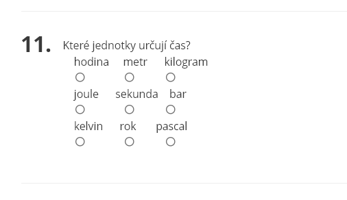 Které jednotky určují čas? hodina metr kilogram :r1a :r2a :r3a joule sekunda bar :r1b :r2b :r3b kelvin rok pascal :r1c :r2c :r3c :r1a:r2b:r2c okMožností s radio tlačítky pak lze vybrat více a zobrazí se následovně: