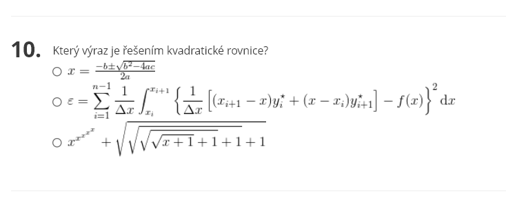Který výraz je řešením kvadratické rovnice? :r1 <M>x=\frac{-b\pm\sqrt{b^2-4ac}}{2a}</M> :r2 <M>x^{x^{x^{x^x}}} + \sqrt{\sqrt{\sqrt{\sqrt{x+1}+1}+1}+1}</M> :r3 <M>\displaystyle\varepsilon=\sum_{i=1}^{n-1} \frac1{\Delta{}x}\int_{x_i}^{x_{i+1}}\left\{\frac1{\Delta{}x} \left[(x_{i+1}-x)y_i^{\star}+(x-x_i)y_{i+1}^{\star}\right] -f(x)\right\}^2{\rm d}x</M> :r1 ok - 11.Obrázky a multimédia ve zdrojovém souboru sady otázek