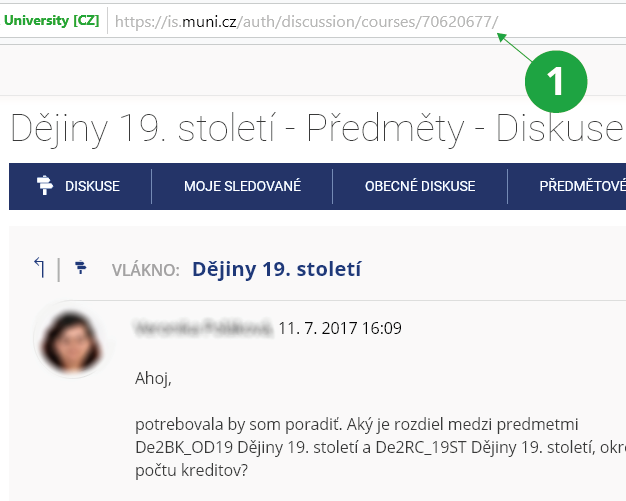 - Diskusní fórum: do osnovy lze vložit odkaz na diskusní fórum (jakéhokoliv) předmětu i přímo na konkrétní diskusní vlákno. Číslo vlákna zjistíte v adresním řádku v diskuzích: