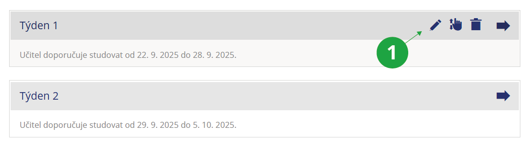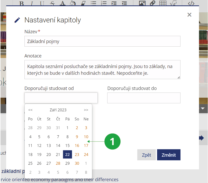 - 10.Zobrazení osnovyPro každou kapitolu osnovy lze nastavit doporučený interval pro studium, dle kterého volbou „zveřejnit až od” můžete zařídit, že kapitola bude studentům přístupná až od určitého data. Týdenní harmonogram nastavíte kapitole jednotlivě v nastavení kapitoly. Pokud nastavujete harmonogram pro více kapitol najednou, je lépe využít aplikaci „Hromadné změny“.
