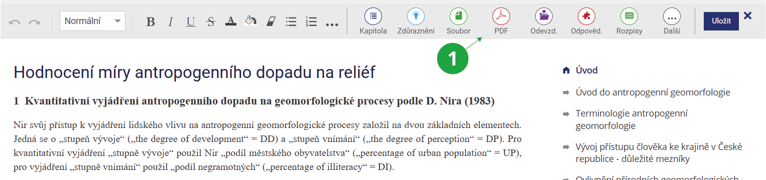 Nové prvky je možné vložit kliknutím na příslušnou ikonu v editační liště. Vloží se na místo, kde je v textu aktuálně kurzor:1 Po najetí myší na kapitolu se zobrazí ikonky možností: upravit nastavení kapitoly, přemístit kapitolu, smazat kapitolu či přejít na kapitolu.