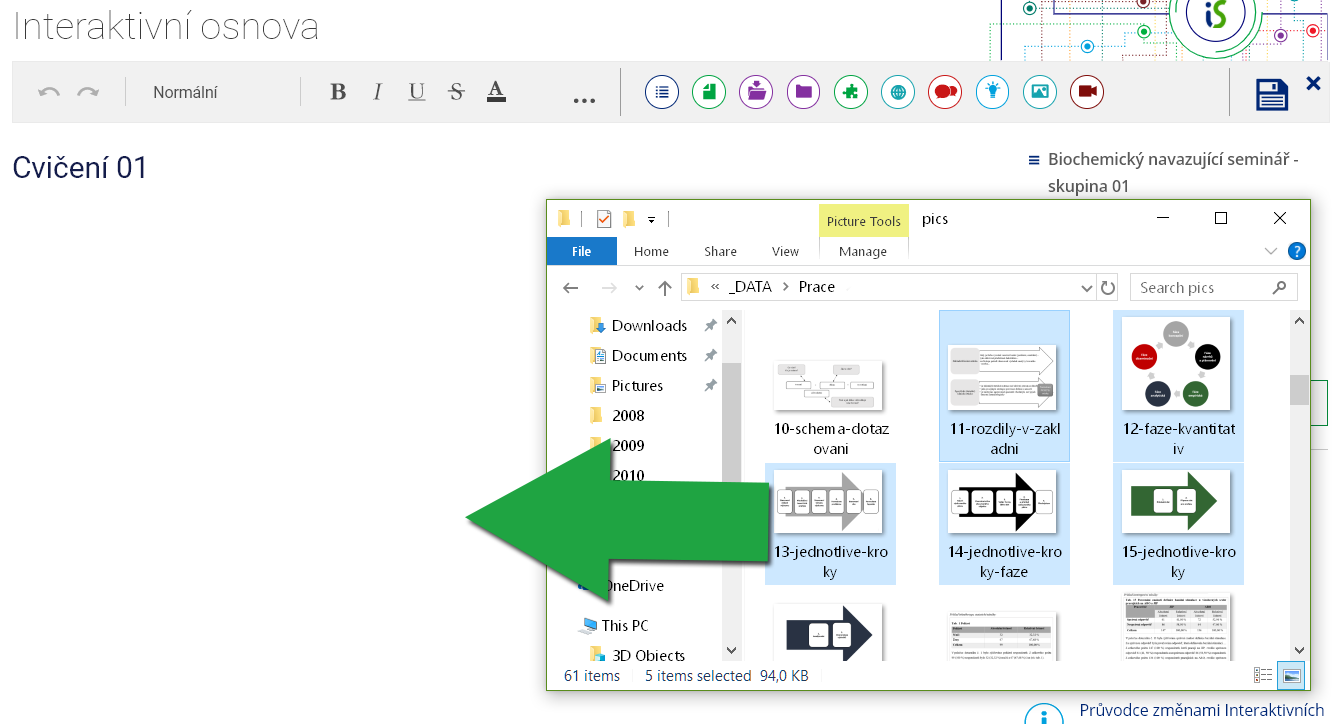Materiály zobrazované v interaktivní osnově, tedy obrázky, PDF, videa apod., mohou být buďto vložené někde ve studijních materiálech a odkazované odsud, nebo je lze uložit přímo do interaktivní osnovy.