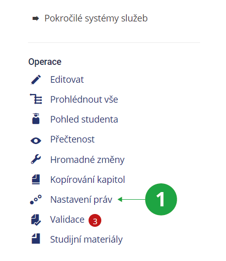 - U souboru s osnovou zkontrolujete (případně změníte) práva přímo v editaci osnovy, kde v pravém menu operací kliknete na „Nastavení práv” a v zobrazeném dialogu pak přidáte právo studentům vašeho předmětu.
