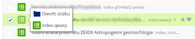 Soubor interaktivní osnovy a do ní vložený obsah je uložen ve studijních materiálech předmětu. Nachází se v kořenové složce agendy Studijní materiály a má vždy příponu QWARP, například index.qwarp.