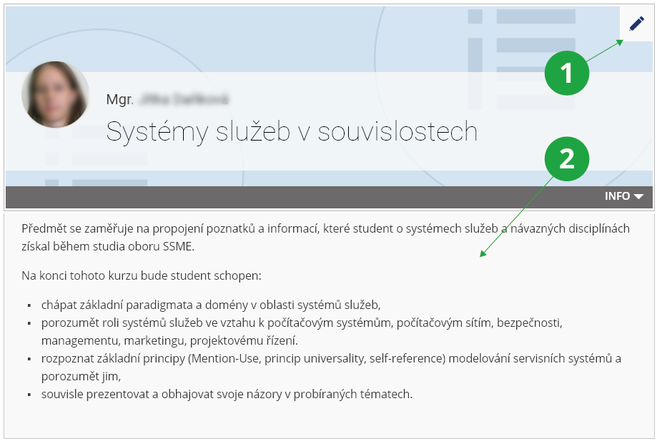 - 9.Úvodní banner a informacePokud si přejete na úvod studentům něco sdělit, je možné využít prostor pro to určený: „Úvodní text“. Zobrazí se hned na počátku interaktivní osnovy a může obsahovat shrnutí podstatných informací, například kontakt na vyučujícího, konzultační hodiny, požadavky k ukončení apod. Úvodní text vyplníte v:Informační systém Učitel [výběr předmětu] Interaktivní osnovy Editovat Upravit (ikona tužky vpravo nahoře v banneru s názvem osnovy)