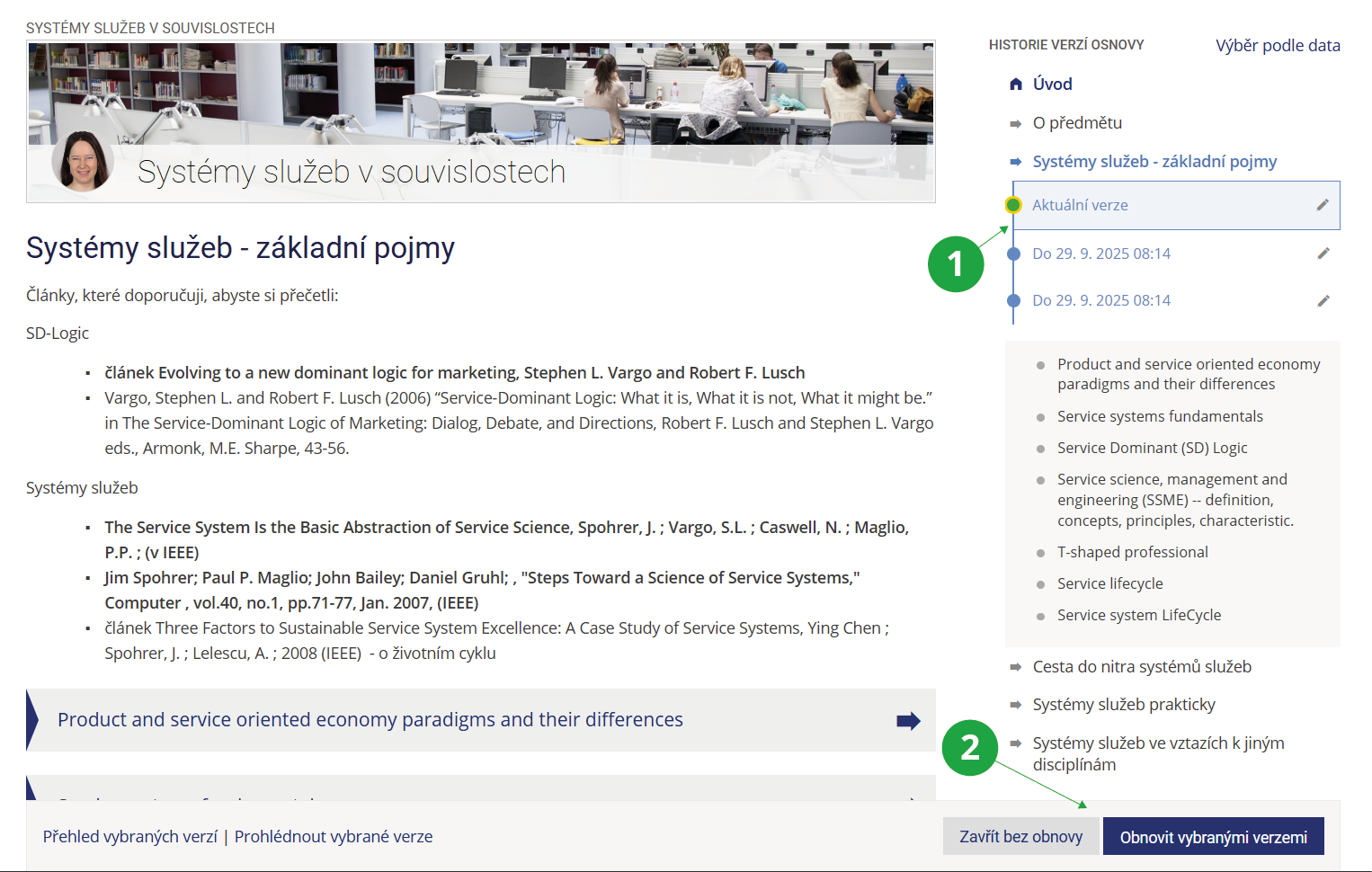 1 Spodní lišta s ovládacími prvky umožňuje obnovit vybranou verzi interaktivní osnovy, kterou uživatel vidí.