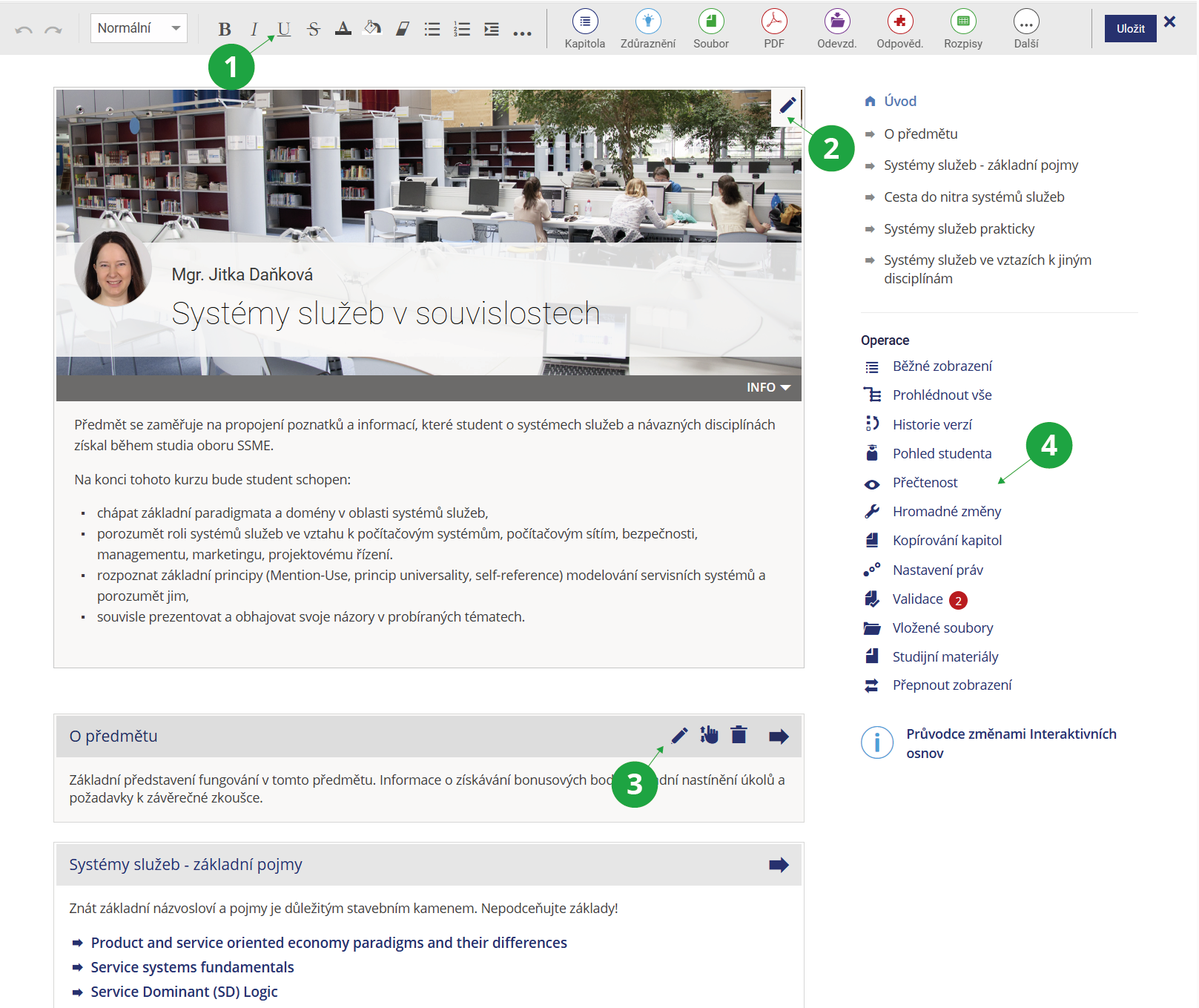 Vyučující může osnovu plnit a upravovat v editačním módu (volba „Editovat“ v menu operací u vybrané osnovy). Zobrazení osnovy v editačním módu:1 Název interaktivní osnovy.