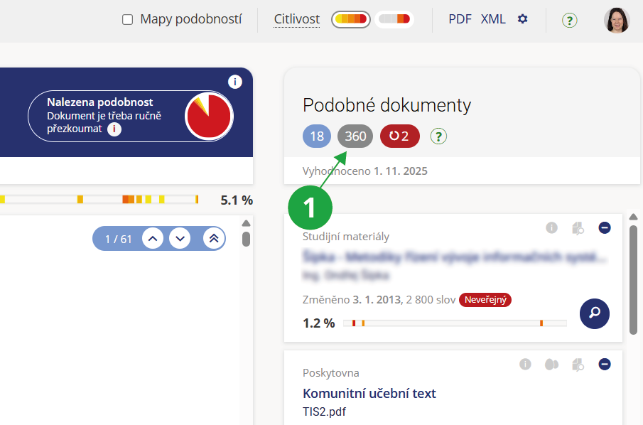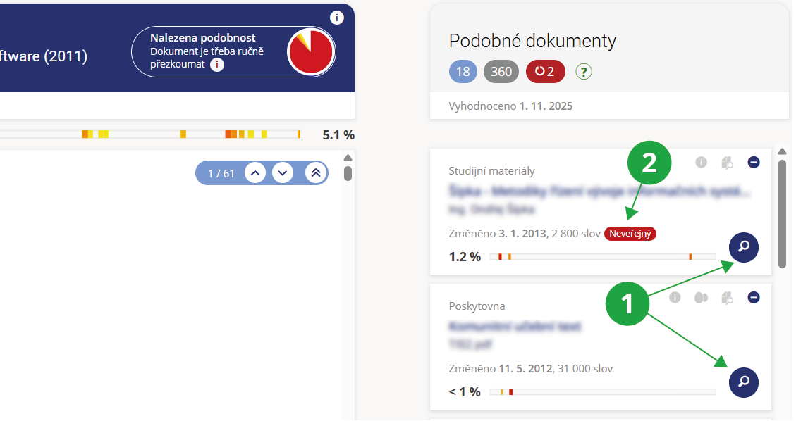 - Uživateli se zobrazí ty nejvíce relevantní dokumenty, u kterých dochází k významné podobnosti s hledaným dokumentem, a procento míry této podobnosti.