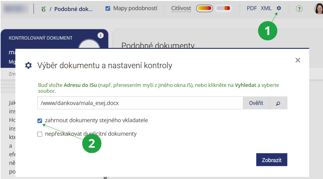 2 Pro porovnávání i mezi Vašimi vlastními dokumenty zaškrtněte volbu „zahrnout dokumenty stejného vkladatele“.