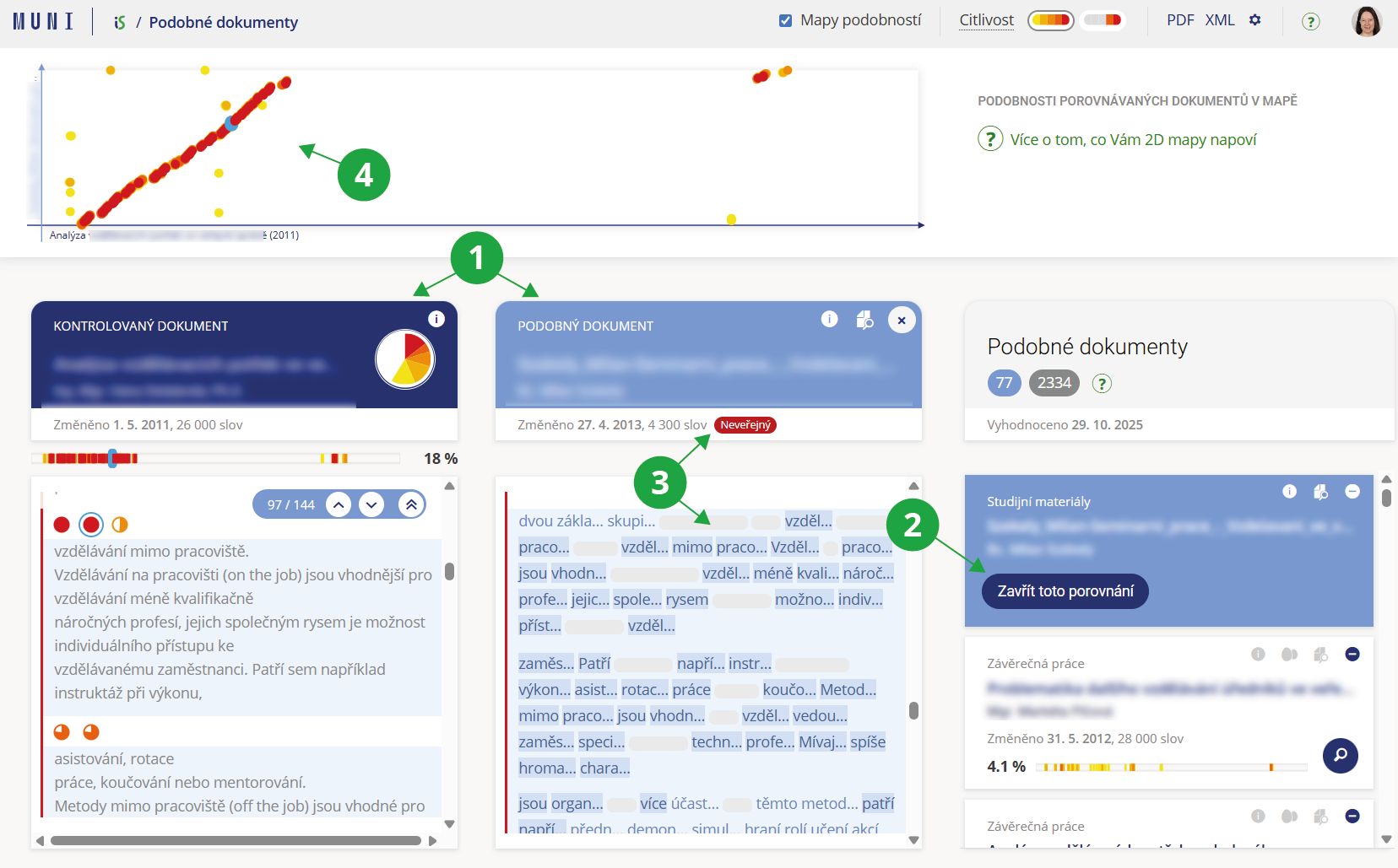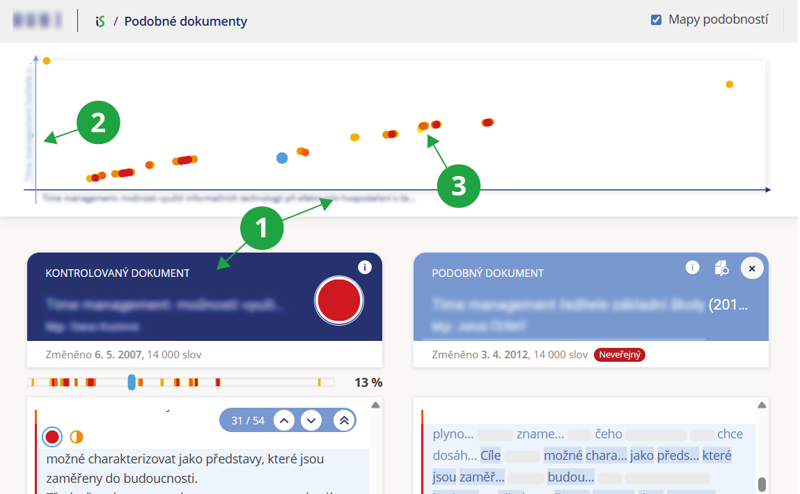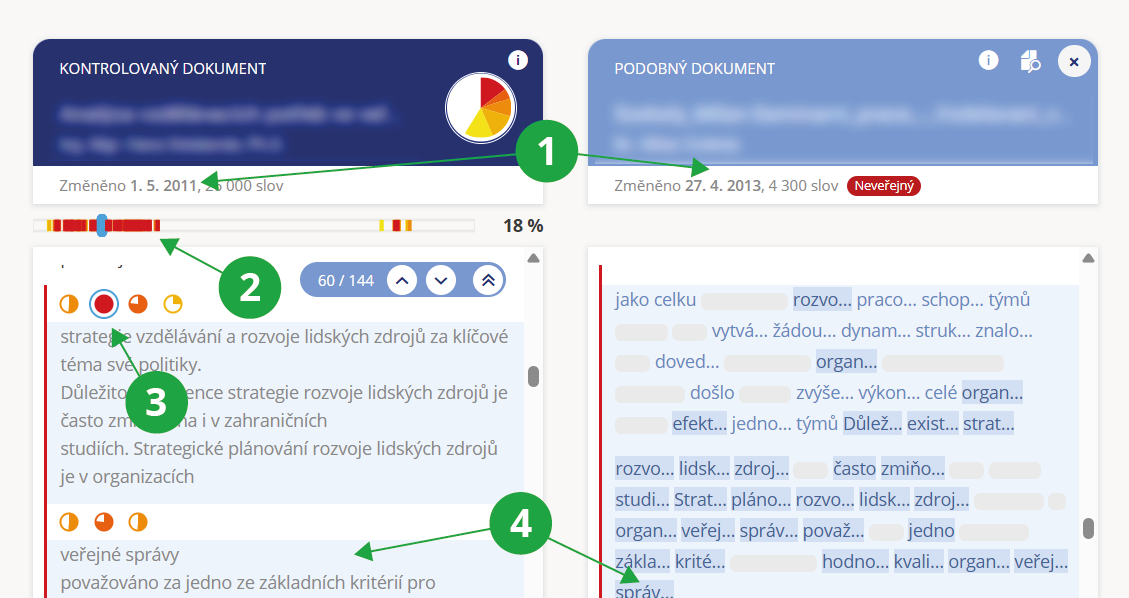 3 Barevné tečky ukazují podobné pasáže obou dokumentů, barva značí míru podobnosti. Kliknutím na barevnou tečku zvýrazníme příslušné pasáže v obou dokumentech.