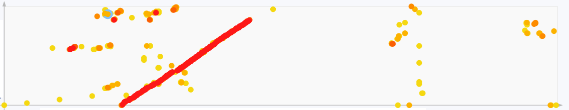 Shluk bodů v pravé horní části textu jsou delší sousloví – citace v seznamu literatury. Může naznačovat, že práce vycházejí z podobných zdrojů, ale o plagiát se v tomto případě nejedná. Víceméně diagonální směr naznačuje, že články jsou odkazovány v podobném pořadí, tříděné podle stejného kritéria (např. rok vydání).