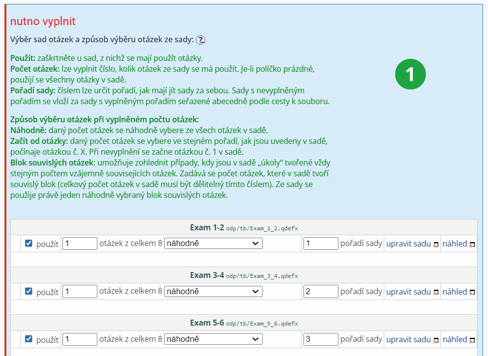- postupně otázky z jednotlivých sad, v rámci každé sady zamíchat náhodně – používá se v případě použití více sad – náhodně promíchá otázky ze sady a zároveň bude dodrženo nastavené pořadí sad (pokud je upřesněno). Nejprve tedy budou v testu náhodně namíchané otázky z první sady, poté náhodně namíchané otázky z druhé sady atd.