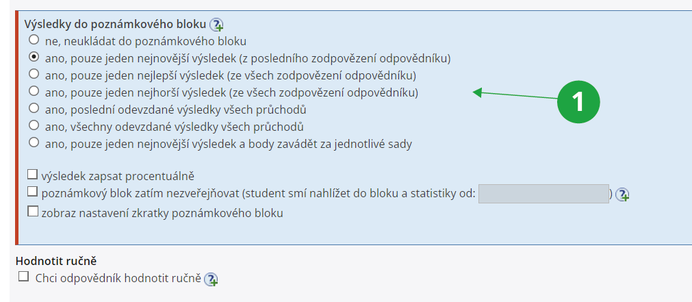 - „ano, pouze jeden nejnovější výsledek a body zavádět za jednotlivé sady“: tuto možnost používejte ve výjimečných situacích, kdy potřebujete rozlišit získané body z jednotlivých sad otázek.
