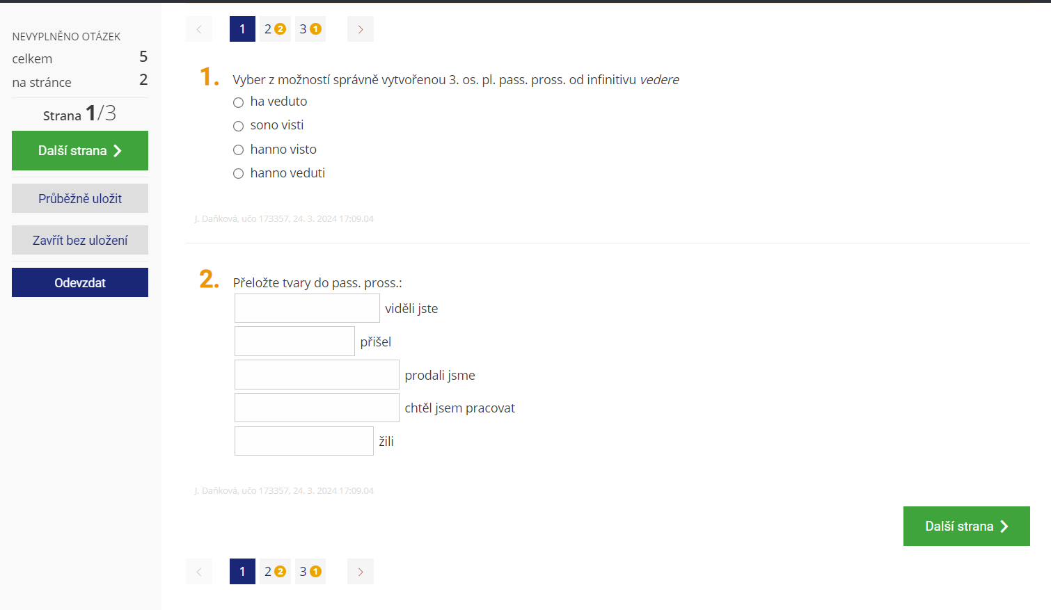 Mezi stránkami se studenti přepínají pomocí tlačítek. Stránkování může také ztížit opisování z obrazovky souseda. Při přechodu z jedné stránky na druhou dochází navíc automaticky k průběžnému uložení. Pokud zároveň zaškrtnete volbu „nepovolit studentovi vracet se na předchozí stránku“, tak se student po přechodu na další stránku již nebude moci k předchozím otázkám vracet a upravovat svoje odpovědi.1 Ukázka odpovědníku stránkovaného po dvou otázkách.