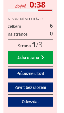 - 15.Přijde student o všechny odpovědi, pokud při odevzdání dojde k chybě?Aby se předcházelo případům, kdy student z nějakého důvodu test omylem neuloží (např. kvůli výpadku počítače nebo výpadku internetového připojení), mohou studenti při vyplňování odpovědníku využít funkci „Průběžně uložit“. V takovém případě bude mít student po opětovném spuštění odpovědníku uložené svoje předchozí odpovědi ve stavu, v jakém byly při posledním průběžném uložení. Pokud chcete minimalizovat riziko, že student o svoje odpovědi během vyplňování odpovědníku omylem přijde, je dobré studenty na tuto funkci předem upozornit. Odpovědníky se automaticky všem studentům průběžně ukládají přibližně 10 minut od posledního průběžného uložení (nebo otevření).