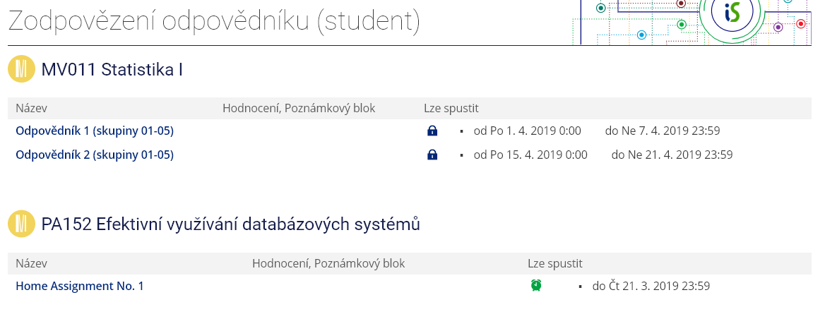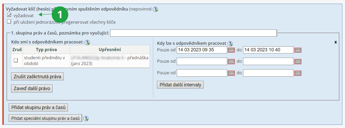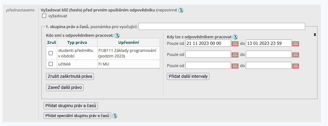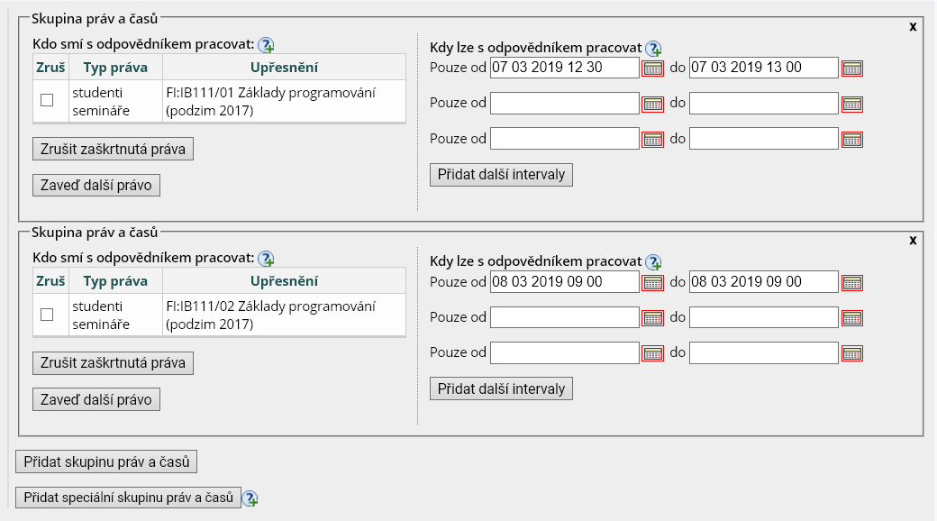 Lze přidávat i speciální skupinu práv a časů. Tato možnost slouží především pro nastavení odpovědníků pro studenty se specifickými nároky (typicky využije Teiresiás).1 Ukázka použití skupin práv a časů – jedna seminární skupina může s odpovědníkem pracovat v jeden den a druhá v další.