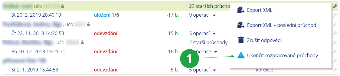 Pokud si poznámkový blok nepřejete, zaškrtněte „ne, neukládat do poznámkového bloku“. V případě, že se studentovy odpovědi neuloží korektně (například v důsledku chyby připojení), jeho výsledky se nezavedou do poznámkového bloku. Pro dodatečné zavedení dílčího počtu bodů můžete využít možnost „Ukončit rozpracovaný průchod“ (pokud student v odpovědníku využíval tlačítko uložení). ZvolteInformační systém Učitel [výběr předmětu] Správa odpovědníků [vybraný odpovědník] odpovědi [vybraný student] Ukončit rozpracovaný průchod1 U vybraného studenta lze přes ikonu montážního klíče zobrazit operace a mezi nimi vybrat „Ukončit rozpracované průchody“.