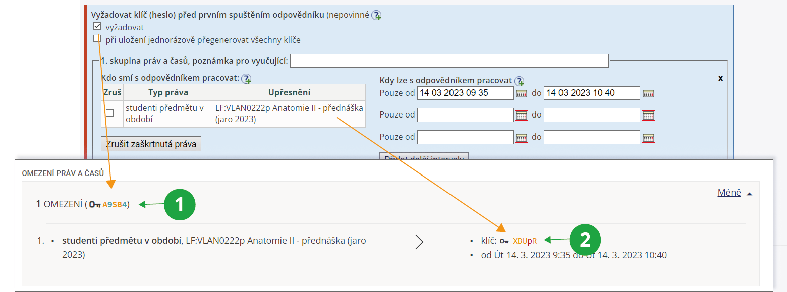 Univerzální i individuální klíče jsou vyučujícím dostupné na stránce „Zodpovězení odpovědníku“ v sekci „Omezení práv a časů“: