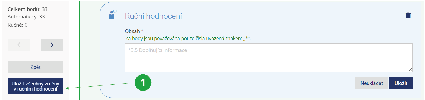 Do pole pro ruční hodnocení lze vkládat text i body. Body je nutné vždy označit hvězdičkou. V levém panelu se zobrazuje počet bodů udělených automaticky, ručně, i jejich celkový počet. Pracuje-li vyučující na hodnocení více otázek, je možné ruční hodnocení uložit hromadně kliknutím na „Uložit všechny změny v ručním hodnocení“.1 Individuální ruční hodnocení.