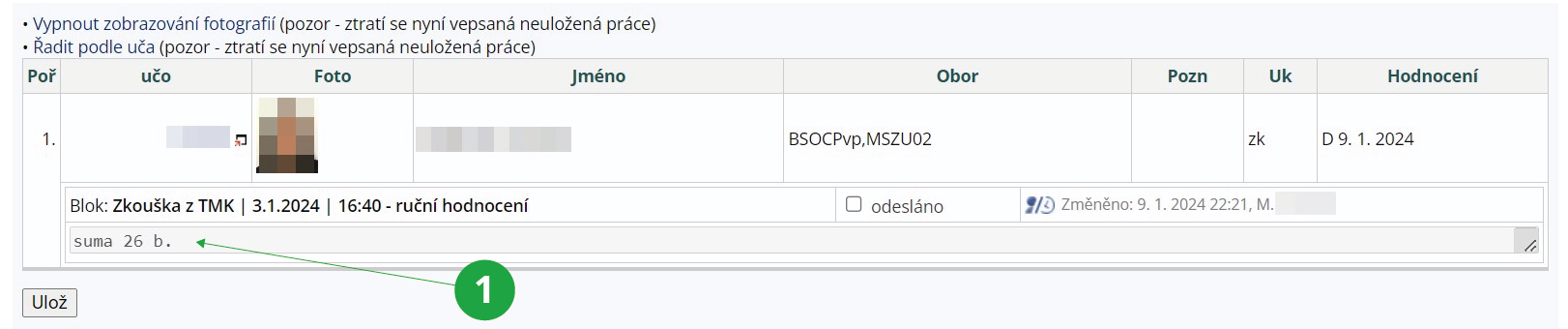 Pokud student v jednom z průchodů odpovědníkem dosáhne minimálního počtu bodů, objeví se v poznámkovém bloku *1, což znamená v tomto případě „splněno“, nikoliv počet získaných bodů. V případě, že student minimálního počtu bodů nedosáhne, bude mít v poznámkovém bloku *0.