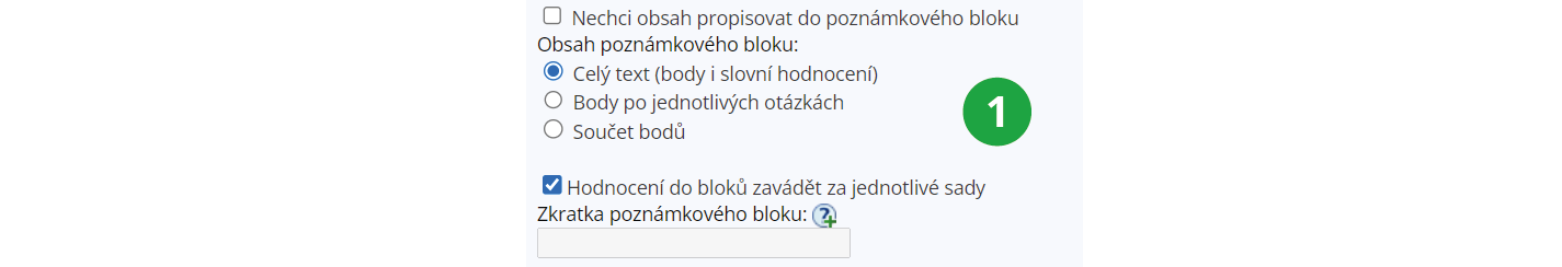 Dle preferencí vyučujícího se ruční hodnocení v poznámkovém bloku zobrazí jako celý text i s body (které jsou vždy označené hvězdičkou), pouze body nebo celkový bodový součet. Ruční hodnocení je možné zavádět i za jednotlivé otázky zvlášť. Volba zkratky poznámkového bloku slouží k definování obsahu, který se má započítávat do uživatelské sumarizace.1 Nastavení formátu ručního hodnocení v popisu odpovědníku.