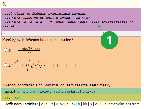 Zápis matematických výrazů jak v zadání otázky, tak u jednotlivých odpovědí se zadává pomocí LaTeXové notace do tagu <M>, které jsou vysázeny do obrázku.