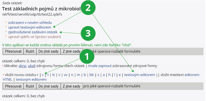 Celou sadu či jednotlivé otázky lze upravit textovým editorem.