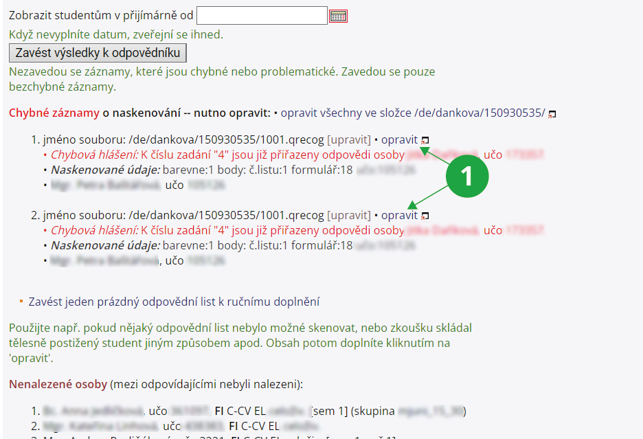 1Po kliknutí na „opravit“, je možné doplnit chybějící údaje do připravených kolonek, jestliže údaje na odpovědním listu jsou a pouze nebyly rozpoznány.