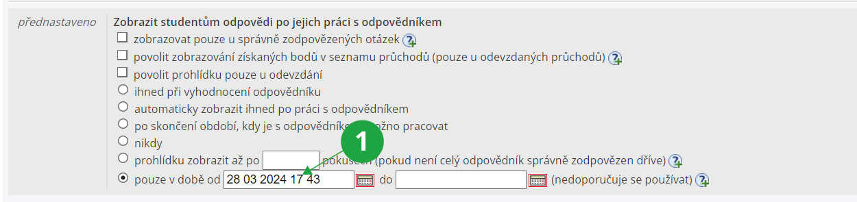 Kdo smí s odpovědníkem pracovat:1 Volby nastavení prohlídky. V případě omezení prohlídky „pouze v době do“ je potřeba počítat s tím, že si studenti mohou zobrazené otázky například vytisknout z prohlížeče a mít je tak k dispozici i po uplynutí tohoto data.