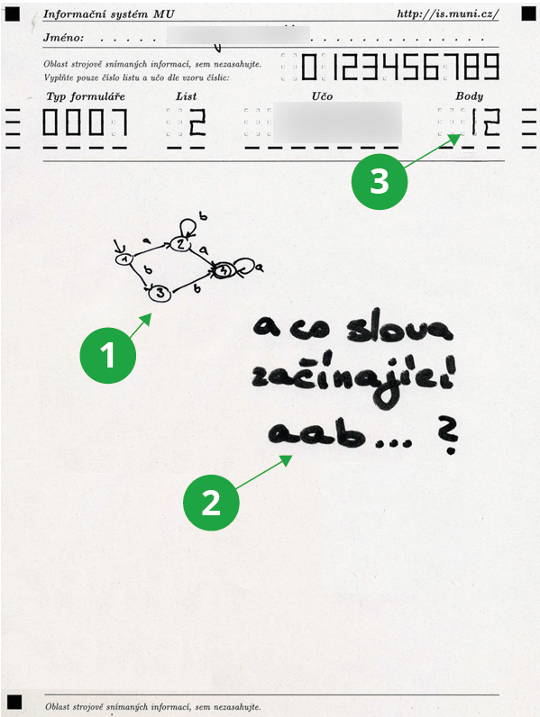 - Student vyplní číslo listu (celkem použije např. 3 listy – na každém bude jedna otázka nebo několik otázek) a svoje učo. Student písemku vypracuje.
