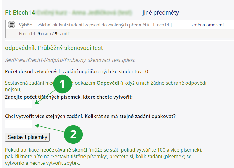 1 Kolonka pro zadání potřebného počtu písemek. Lze se inspirovat počtem studentů předmětu zobrazeným pod názvem předmětu, alternativně lze změnou omezení zobrazit například počet přihlášených ke zkušebnímu termínu.