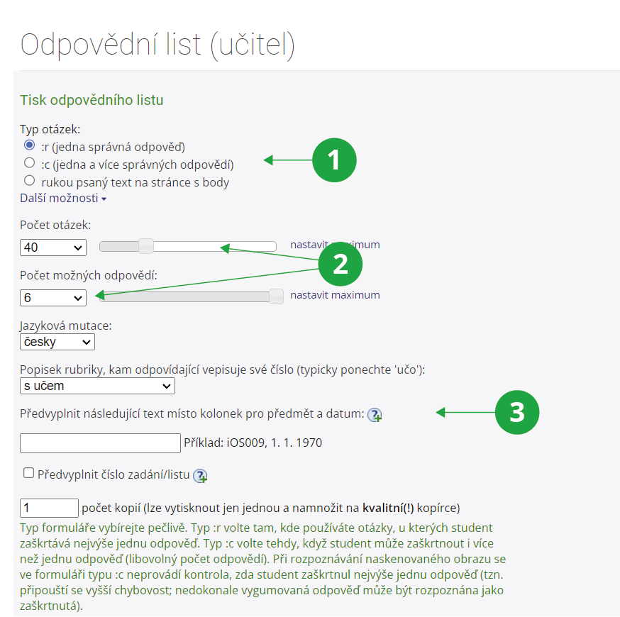 Informační systém Učitel [výběr předmětu] Správa odpovědníku Tisk: Odpovědní listVyberete typ otázek, které používáte ve vašem zadání (typ :r pro výběr právě jedné správné odpovědi, typ :c pro výběr alespoň jedné správné odpovědi, případně rukou psaný text na stránce s body, pokud používáte otevřené odpovědi). Vyberte si jazykovou mutaci a způsob přiřazení odpovědí osobě (typicky ponechte volbu „s učem“ - další slouží např. pro skenování odpovědí uchazečů o studium (volba „s číslem přihlášky“) nebo pro odpovědi osob zcela bez vztahu k UR (volba „s Vámi vybraným číslem“). Poté zadáte počet odpovědních listů, které chcete tisknout (je dobré vytisknout jich větší množství než je zadání, protože pokud student otázku špatně zaškrtne a chce svou odpověď změnit či už vyčerpal možný počet oprav, dostane nový odpovědní list a vyplní odpovědi znovu) a vytisknete.