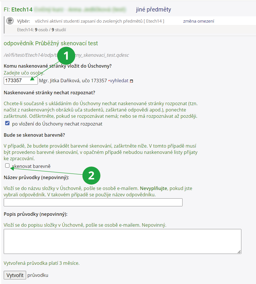 Informační systém Učitel [výběr předmětu] Správa odpovědníku Tisk: PrůvodkaZadáte učo osoby, které pak vložíte naskenované písemky do Úschovny a zaškrtnete, že chcete po vložení do Úschovny nechat písemky rozpoznat. Vytisknete průvodku a při skenování písemek ji naskenujete; při posílání do IS ji pak umístíte buď před nebo za naskenované písemky. Více informací o posílání naskenovaných písemek do IS najdete vInformační systém Tisk Skenování do ISu