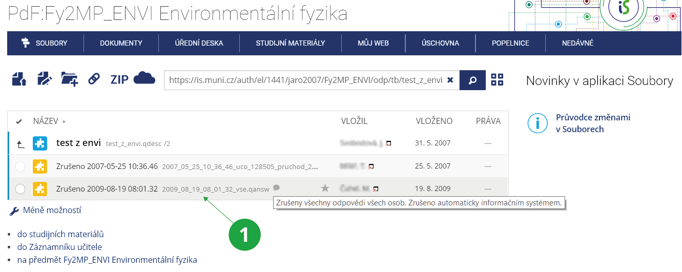 Informační systém Učitel [výběr předmětu] Správa odpovědníku Nahlížení do odpovědních listůOdpovědi studentů se automaticky ruší po uplynutí pěti let od sestavení otázek.1 Soubor se zrušenými odpověďmi ve správci souborů.
