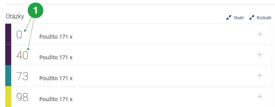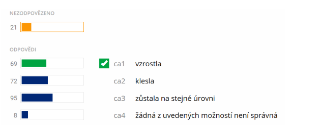 Hned na první pohled je u otázky vidět rozložení odpovědí studentů. Převažování špatných odpovědí může být impulzem k revizi formulace otázky, případně může napovídat, že danou látku je potřeba se studenty více probrat.1 Nastavení řazení jednotlivých otázek v Obtížnosti.