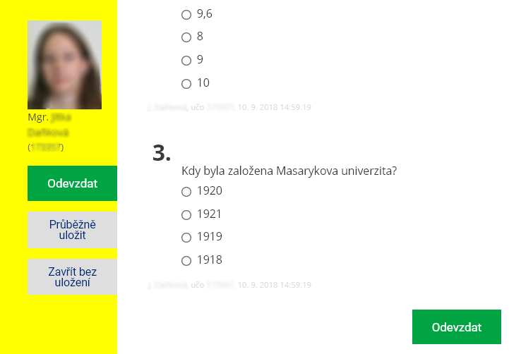 - Pokud jste u odpovědníku nastavili zobrazení levého pruhu (viz předchozí odstavec) zobrazí se v něm zároveň identita odpovídajícího, tedy učo, jméno a fotografie přihlášené osoby. Usnadní kontrolu totožnosti odpovídající osoby.