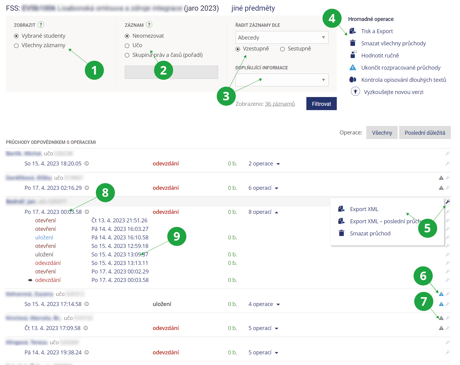 9 Seznam operací odpovídajícího v průchodu; kliknutí na datum a čas operace zobrazí prohlídku odpovědí v době dané operace.