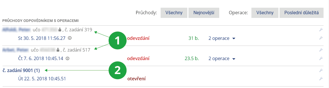- Jedná se o doplňkové informace zejména pro případy, kdy student hlásí potíže při práci s odpovědníkem. Jsou to upozornění na nestandardní počet nebo pořadí některých operací. Nesoulad v počtu provedených operací upozorňuje na situace, kdy nastal nesoulad v počtu otevření a odevzdání odpovědníku (více otevření než odevzdání nebo naopak). Znovu otevřený průchod upozorňuje na situaci, kdy odpovídající již alespoň jednou odevzdal své odpovědi v průchodu, ale poté se znova k testu vrátil kliknutím na „Znovu odpovídat“ a od té chvíle zatím neprovedl žádnou změnu v odpovědích. U průchodu dosud bez odpovědí odevzdávající sestavil nové zadání, ale nevyplnil v něm ani jednu odpověď.