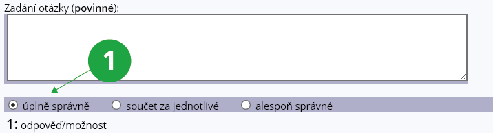 - úplně správně – uvedené body se přidělí, pokud student zaškrtne úplně všechny odpovědi, které učitel označil za správné, a nezaškrtne žádnou možnost navíc. V textovém formátu otázky vyjádřeno pomocí „ex ok“.