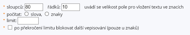 - Ve formuláři lze zapnout počítání znaků nebo slov a nastavit limit pro jejich vepsání. Pouze u znaků je po překročení limitu možné blokovat další vepisování.