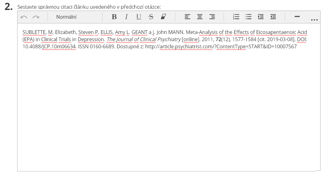 Otázku lze například použít v odpovědníku zaměřeném na problematiku správných citací, kdy musí studenti umět správně použít i formátování – vyznačení kurzívy, tučného písma atd.