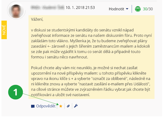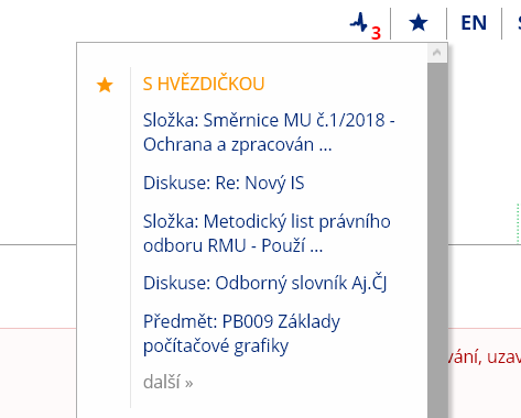 Příspěvky označené hvězdičkou uvidíte se zobrazují v horním panelu systému pod ikonkou hvězdičky. Je možné zde procházet všechny položky, které jste označili za pomocí hvězdičky.1 Označení příspěvku hvězdičkou v Diskusním fóru.