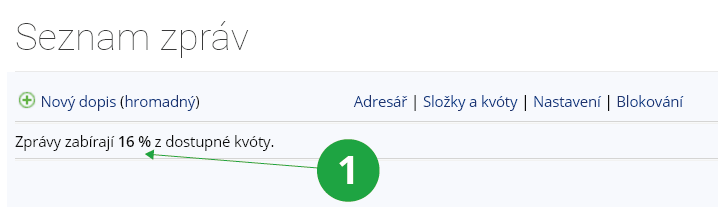 - Každá schránka má nastavenou kvótu, tj. maximální velikost uložených dat a maximální velikost jedné zprávy. Při překročení kvóty se budou přijímat pouze zprávy administrativního charakteru z IS UR (např. dopis od učitele o výsledku zkoušky), ale pošta ze světa nebo od ostatních uživatelů IS UR nebude doručena.