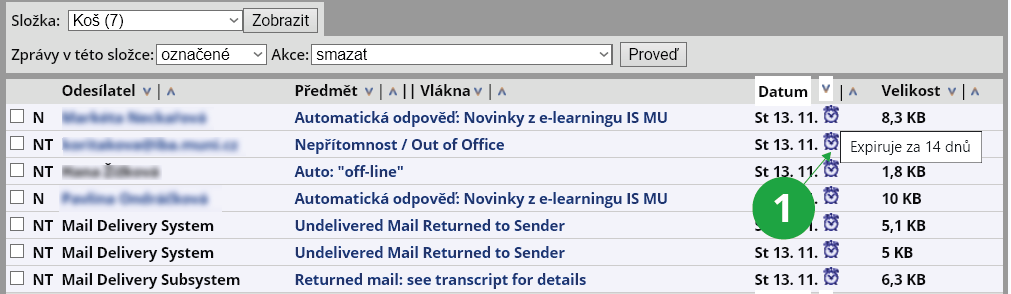 - 8.Jak dlouho zůstávají dopisy v koši?Dopisům přesunutým do koše je nastavena expirace 14 dní, po uplynutí této doby se dopisy automaticky smažou. U zpráv, kterým zbývá do expirace méně než 14 dní, se zobrazuje budík (vedle data přijetí zprávy). Najetím myši na symbol budíku zjistíte, kolik dnů zbývá do expirace zprávy.