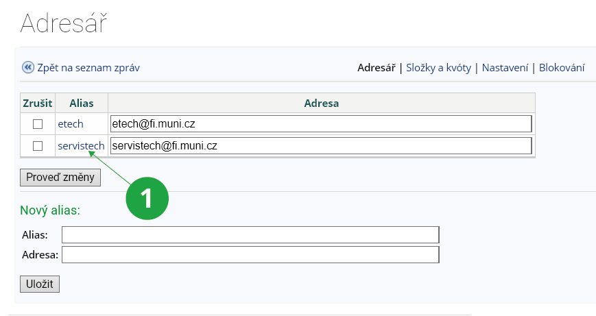 Do adresáře se automaticky přidávají i adresy, na které odešlete e-mail (včetně adres mimo IS UR). Tyto adresy se vám pak zobrazují při psaní nového dopisu v našeptávači adres. Osobě z adresáře můžete psát dopis rovnou – vstupte doInformační systém Pošta Adresářklikněte na alias a otevře se nové okno pro psaní nového dopisu s předvyplněným adresátem. - 13.Jak si nastavím poštovní přezdívku pro moji e-mailovou adresu?Použijte:Informační systém Systém Změna přezdívkyzadejte zvolenou přezdívku a uložte. Zde můžete později přezdívku i zrušit pomocí volby „Chci smazat přezdívku, nechci ji měnit“. Přezdívka smí obsahovat pouze písmena a číslice, na velikost písmen se nebere zřetel a nesmí obsahovat českou diakritiku. Musí být alespoň tři znaky dlouhá. Nesmí začínat číslicí. I na volbu přezdívek se vztahuje pravidlo užití systému o slušném vyjadřování v otevřené komunikaci; správci systému mají právo zrušit přezdívku, jejíž znění odporuje slušnému chování. Není dovoleno záměrně volit přezdívku, která by mohla uvést ostatní uživatele v omyl ohledně Vaší identity. Vybrat lze pouze takovou přezdívku, kterou dosud nikdo na UR nevlastní. Je vhodné zvolit si přezdívku, která dalším osobám napomůže při vaší identifikaci.